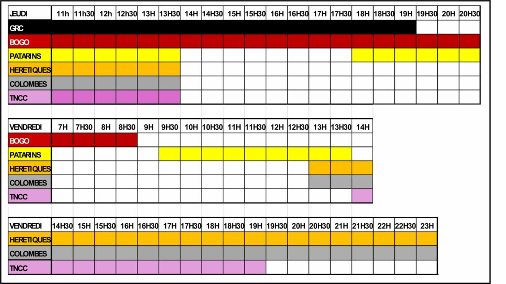 - Raid des Bogomiles : jeudi 24 de 16h à 20h et vendredi 25 de 7h à 8h30